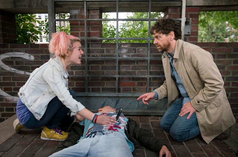 Strahl (Christoph Tomanek, l.), Nina (Julia Schäfle, 3.v.r.), Finn (Sven Martinek, l.) und Lars (Ingo Naujoks, 2.v.l.) untersuchen den Unfall, bei dem die 18-jährige Karoline Hafemann ums Leben gekommen ist.
