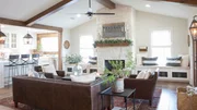 As seen on FIxer Upper, the Eberle's rennovated living room has an open concept floor plan with wood beams and a new stone fireplace. (After #4)