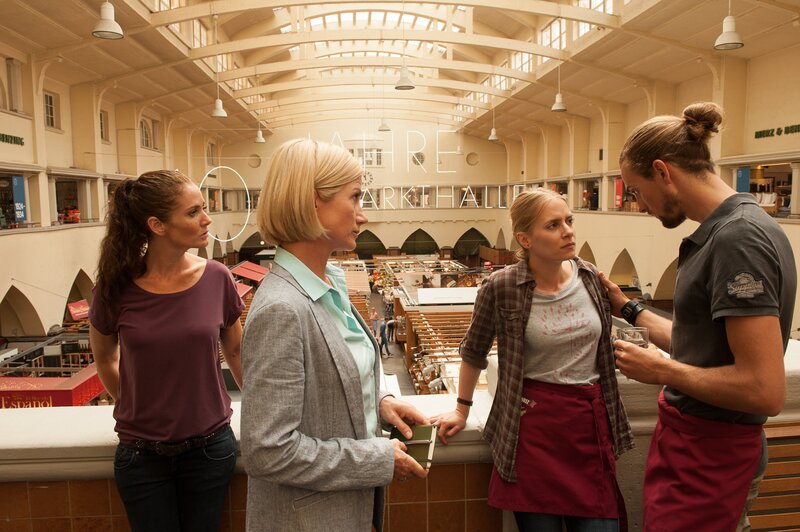 Auf der Empore der Markthalle unterrichten Martina Seiffert (Astrid M. Fünderich, 2.v.l.) und Selma Kirsch (Yve Burbach, l.) die Obsthändlerin Simone Dörfler (Cornelia Ivancan, 2.v.r.) über den Tod ihres Vaters. Ihr Freund Florian Hoss (Pablo Konrad y Ruopp, r.) versucht sie zu trösten.