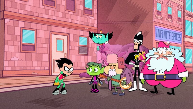 v.li.: Robin, Beast Boy, Tooth Fairy, Sticky Joe, Doctor Light, Santa Claus
