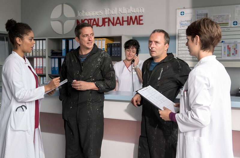 Die Assistenzärztinnen Dr. Theresa Koshka (Katharina Nesytowa, r.) und Vivienne Kling (Jane Chirwa, l.) nehmen zwei ganz spezielle Patienten auf - das Ehepaar Bernd (Stefan Gebelhoff, 2.v.l.) und Bernd König (Robert Schupp, 2.v.r.)!