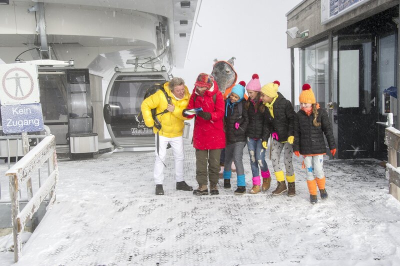 Auf der Alm: Schneewanderung in den Alpen. Singa, Volker Rosin und die TA Kids marschieren munter durch das verschneite Gelände und sehen nicht, wie der Tanztapir, angelockt von beschwingter Hüttenmusik, sich von der Truppe entfernt und auf einer Alm landet. Wild mittanzend sorgt der Tanztapir für Stimmung - und Chaos. Zum Glück können Volker am Piano und die Tanzalarm-Kids helfen.
