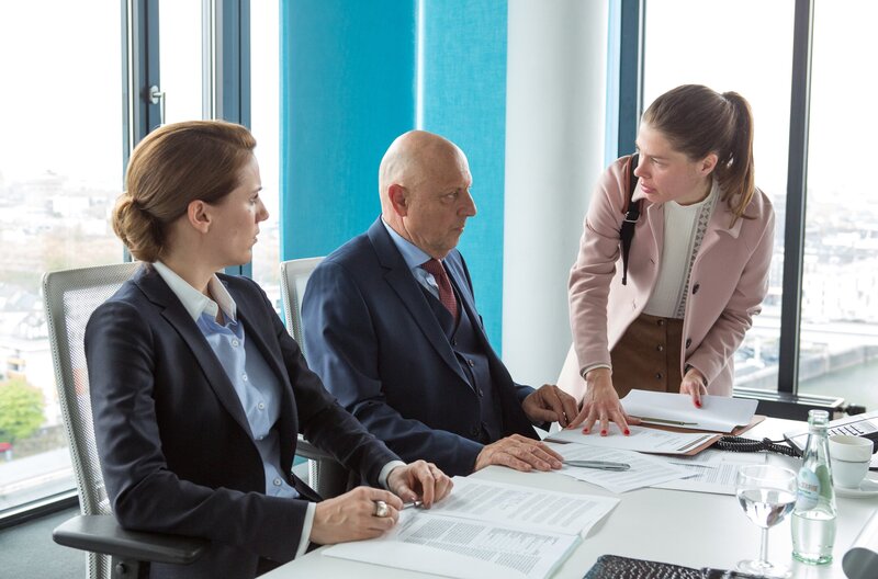 • Carla Temme (Meike Droste, r.) erklärt dem Aufsichtsratvorsitzenden Martin Freidler (Pierre Siegenthaler, M.), dass Katharina Brandt (Bettina Lamprecht, l.) die Tests bestanden hat.