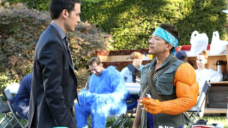 Aubrey (John Boyd, l.) befragt am Set den Schauspieler David Faustino (spielt sich selbst), der sich über das Opfer - den Regisseur des Films - vor dessen Tod fürchterlich aufgeregt hat.