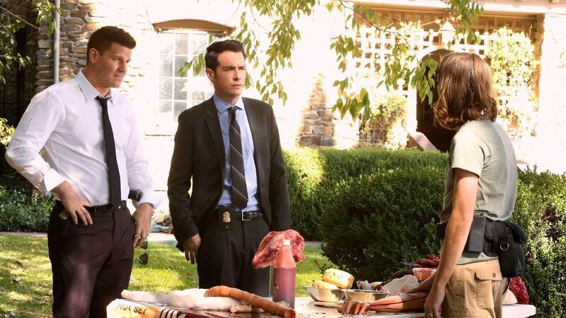 Bei den Dreharbeiten eines trashigen Films suchen Booth (David Boreanaz, l.) und Aubrey (John Boyd, M.) nach Hinweisen auf den Mörder des Regisseurs.