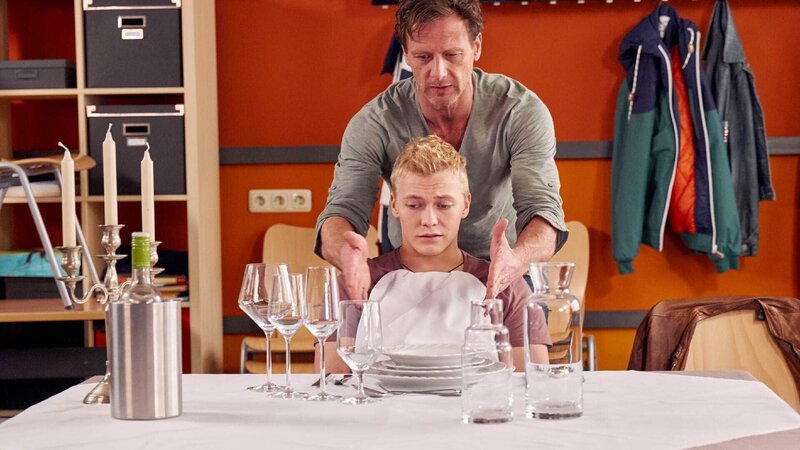 Stefan Vollmer (Hendrik Duryn, oben) coacht Luis (Julius Nitschkoff) in Sachen Restaurant-Manieren; Luis soll sich als Verlagserbe Niklas ausgeben und Roses Schulführung loben.