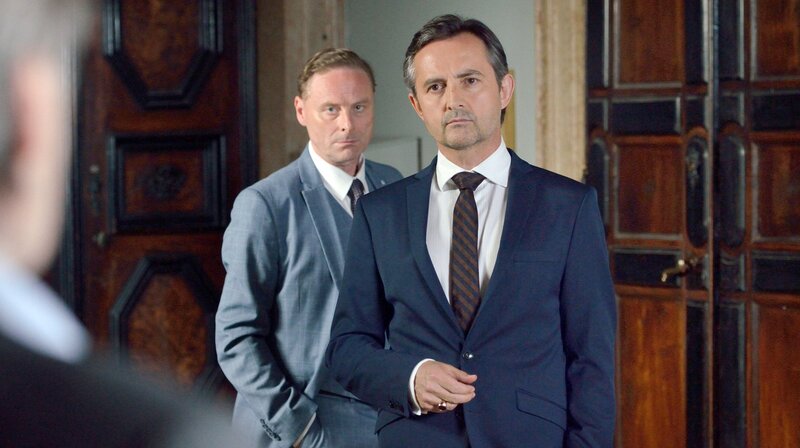 Morosini (Harald Schrott, re.) berät sich mit seinem Anwalt (Hubertus Hartmann, li.). Er gibt zu erpresst worden zu sein, sei aber kein Mörder!