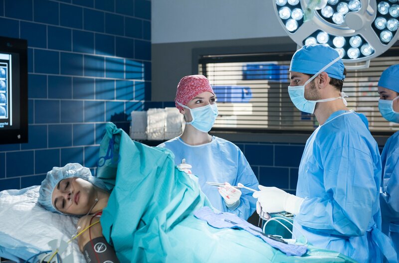 • Zoe (Melina Fabian, l.) hat sich eine Sehne an der Schulter gerissen. Julia Berger (Mirka Pigulla) und Dr. Niklas Ahrend (Roy Peter Link, r., mit Komparsin) müssen operieren.