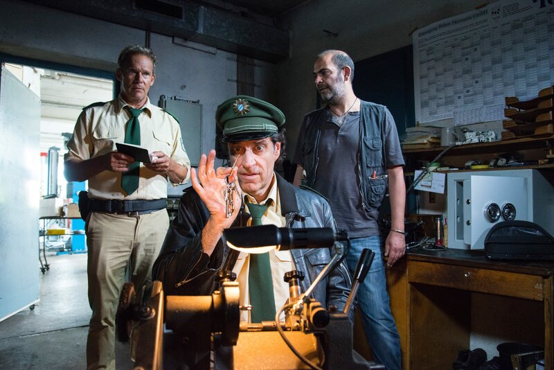 Ausgerechnet auf dem Polizeirevier werden Hubert (Christian Tramitz, l.) und Staller (Helmfried von Lüttichau, M.) auf ihrer Suche nach einem Komplizen des Toten fündig. Handwerker Lutz Tröger (Felix Auer, r.) raubt dort mit Reparaturarbeiten nicht nur Girwidz den letzten Nerv ...
