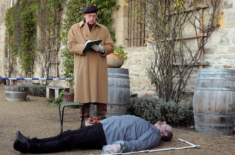 Dr. Münster (Jörg Gudzuhn, hinten) untersucht die Leiche des Chefkochs Dollberg (Jens Holger Lemke).