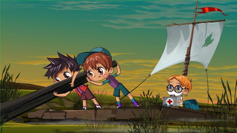 • Keshka und Geshka versuchen das Floß vom Ufer zu schieben während Sumushka mit Maske auf dem Floß sitzt.