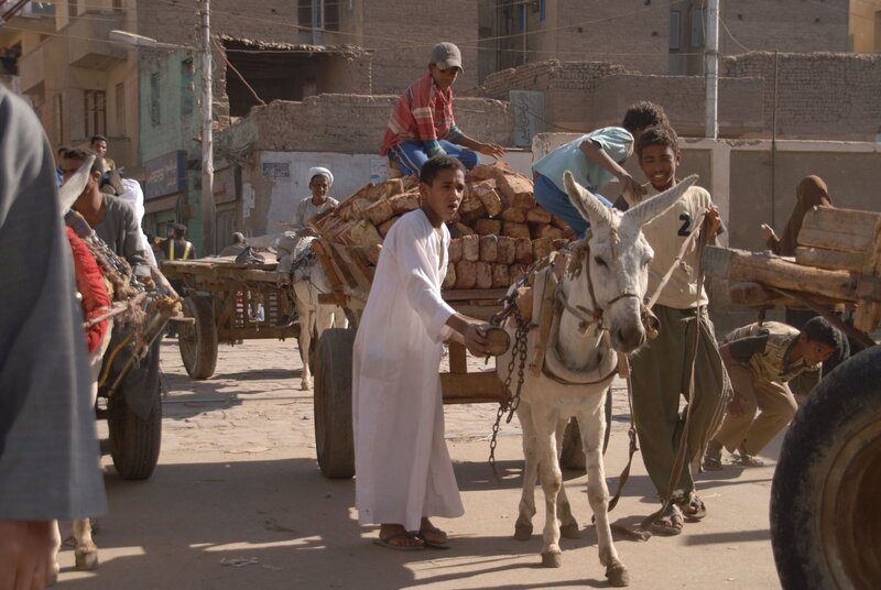 In Ägypten werden Esel auch heute noch in Ehren gehalten, sei es als Arbeits- oder als Freizeitgefährten. Im Bild: Ein Lastenesel bei seiner Arbeit. In den engen Gassen und Straßen der ägyptischen Städte sind Esel auch heute noch oftmals praktischer als Autos.