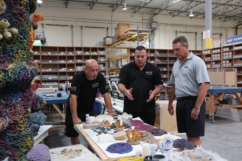 Hornhaie und Hardware: Für die Firma "Samtec" konstruieren Wayde King und Brett Raymer in der Lobby des Unternehmens eine spektakuläre Korallenlandschaft mit einem ausgeklügelten Filtersystem.