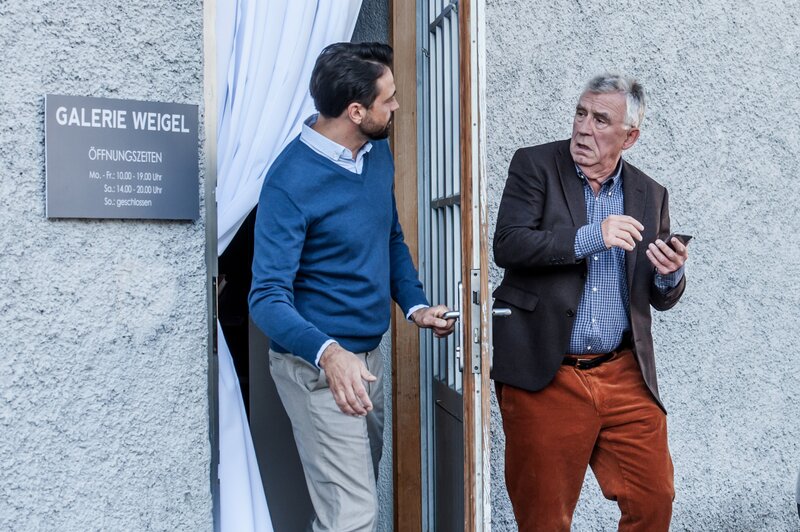 Henrik Weigl (Michael Rotschopf) könnte fast vermuten, dass sich Hannes Kofler (Heinz Marecek) - aus welchem Grund auch immer - hinter seiner Geschäftstür verstecken wollte.