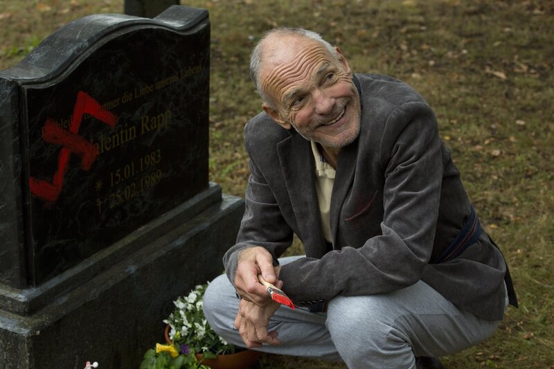 Sascha und Frank finden Hermann (Hans-Peter Hallwachs) auf einem Friedhof wieder, wo er amüsiert Grabsteine mit Hakenkreuzen bemalt.