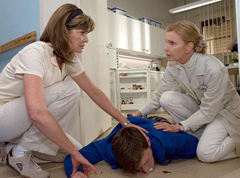 Oberschwester Ingrid (Jutta Kammann, rechts) und Schwester Yvonne (Maren Gilzer) finden Lars Wenke (Steffen Schröder) im Schwesternzimmer. Er ist nach seiner Fressattacke vor dem Kühlschrank kollabiert.