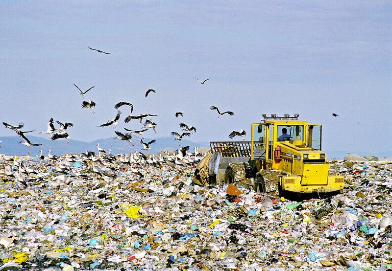• Weißstörche auf der Mülldeponie von Cáceres, Extremadura (Spanien).