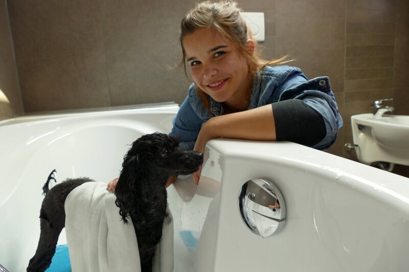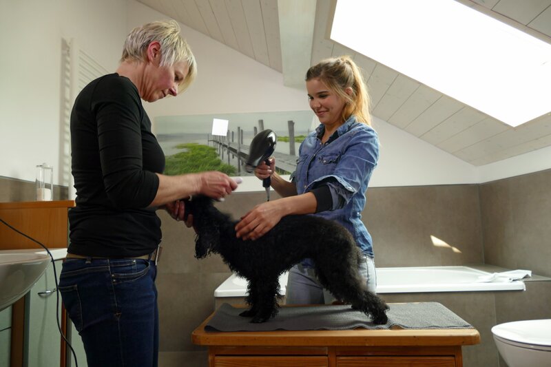 • Alle vier bis sechs Wochen schneidet ein Hundefriseur Apachis Fell. Vor dem Friseurbesuch wird die Pudelhündin gewaschen, geföhnt und gebürstet.