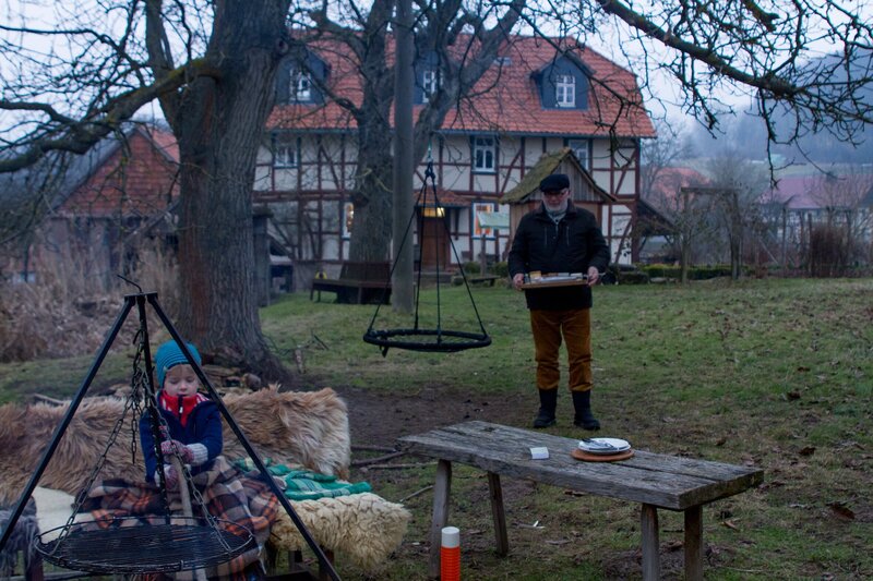 • Opa Karl (Peter Rauch) kommt mit dem Fisch an das Lagerfeuer.