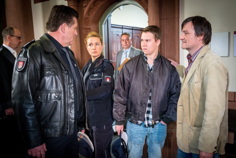 Franzi (Rhea Harder-Vennewald, 3.v.l.) wundert sich über das Verhalten von Hans (Bruno F. Apitz, 2.v.l.), der es nicht lassen kann, Tilo (Dennis Kamitz, 2.v.r.) und dessen Bewährungshelfer Schröter (Christian Kerepeszki, r.) seine Meinung zu Tilos Freispruch zu sagen.