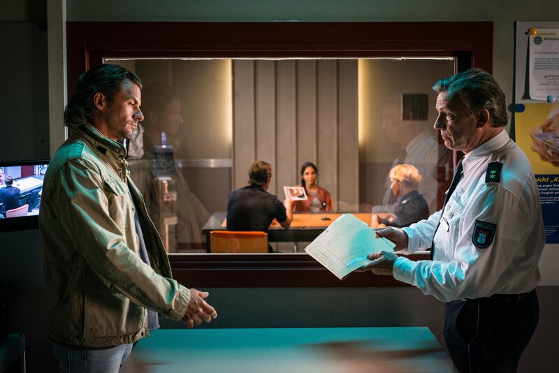 • Mattes (Matthias Schloo, 2.v.l.) und Melanie (Sanna Englund, 2.v.r.) versuchen herauszubekommen, ob Minas (Pegah Ferydoni, M.) Bruder weitere Aktionen geplant hat. Während Haller (Hannes Hellmann, r.) und Tim Schneider (Stephan Luca, l.) die Befragung von draußen verfolgen, zeigt Haller dem Schauspieler die Akte des Verdächtigen.