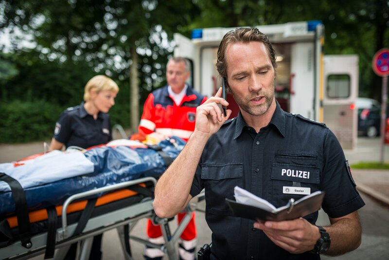 Melanie (Sanna Englund, l.) hat im Einsatz ein Mädchen (Amina Merai, M.) angefahren. Mattes (Matthias Schloo, r.) gibt den Kollegen vom Revier die Daten durch.