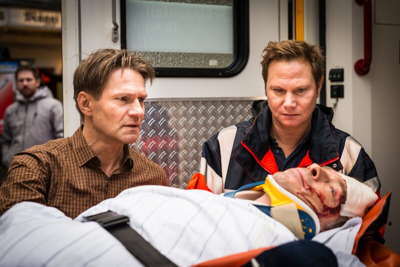 Dr. Haase (Fabian Harloff, r.) kümmert sich um seinen Patienten Werner Karger (André Eisermann, liegend), der mit seinem Wagen auf ein parkendes Auto gerast ist. Peter Martinek (Thure Riefenstein, l.) macht sich Sorgen um seinen Freund.