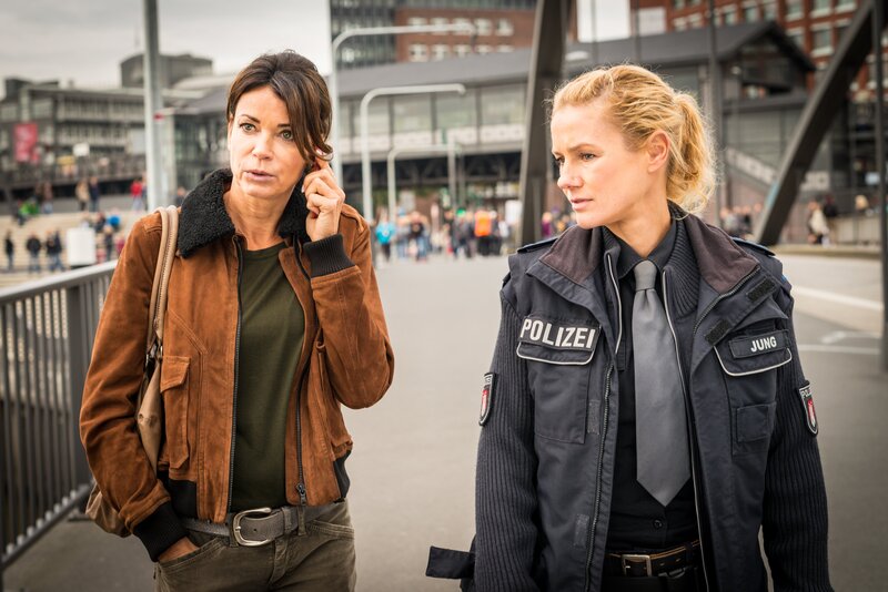 Jasmin (Gerit Kling, l.) ist mit Franzi (Rhea Harder-Vennewald, r.) auf dem Weg ins Revier. Im EKH war es nicht möglich, den Standort des entführten Mädchens zu orten, das sie am Telefon hat.