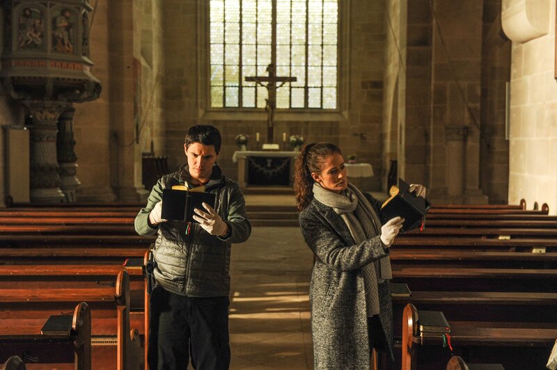 Auf der Suche nach dem entscheidenden Hinweis blättern sich Selma Kirsch (Yve Burbach, r.) und Rico Sander (Benjamin Strecker, l.) durch die Gesangsbücher der Mönche.