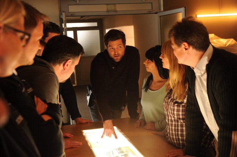 • Die Lage ist angespannt: Jo Stoll (Peter Ketnath, M.) instruiert die Kollegen (Komparsen) über die nächsten Ermittlungsschritte.