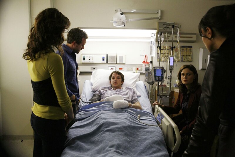 • V.l.: Dr. Sweets (John Francis Daley), Zach (Eric Millegan), Brennan (Emily Deschanel), Angela (Michaela Conlin), Hodgins (TJ Thyne) und Camille Saroyan (Tamara Taylor) trauern um Agent Booth, der anscheinend Opfer eines Anschlages wurde.