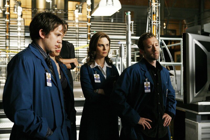 v.li.: Angela (Michaela Conlin), Hodgins (TJ Thyne), Zach (Eric Millegan), Brennan (Emily Deschanel), Camille (Tamara Taylor)