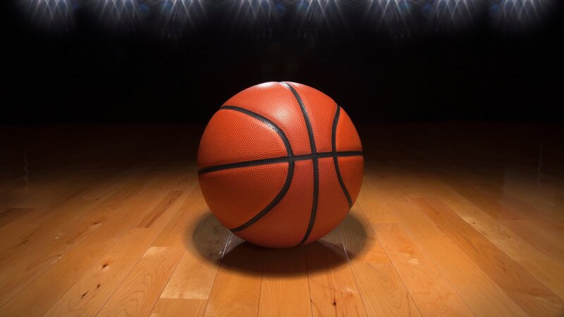 A basketball on a wood floor beneath bright arena lights