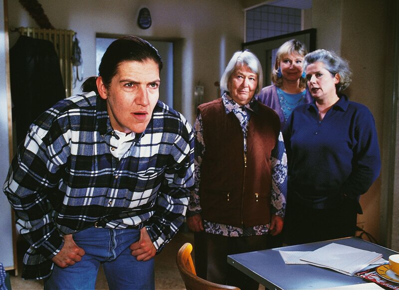 • Andreas (Katy Karrenbauer, li.) bestaunt die Pin-Up-Wand seiner Schwester; (hi.v.li.) Mutz (Brigitte Renner), Ilse (Christiane Reiff) und Uschi (Barbara Freier) bestaunen das "Walter-Double".