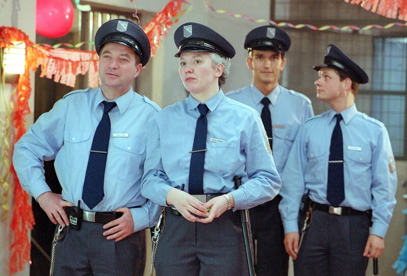 • Jan Paulsen (Sebastian Otto, 2.v.re.) ist kein neuer Kollege von Kittler (Egon Hofmann, li.) und Schnoor (Uta Prelle), sondern ein von Andy (Stefan Puntigam) engagierter Stripper, der sich gleich seiner Uniform entledigen wird...