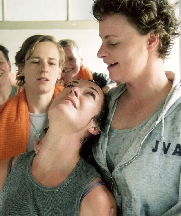 Ines (Freya Trampert, vo. Mi.) wird von den Frauen (v.li.: Claudia Kühn, Komparsin, Aline Staskowiak, Komparsin, Sigrid M. Schnückel) fertig gemacht, weil sie versucht hat, die Frauen gegen Walter aufzuwiegeln.