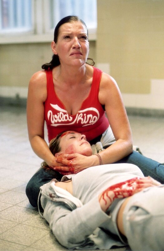 Ines (Freya Trampert, lieg.) liegt sterbend in Walters (Katy Karrenbauer) Armen...