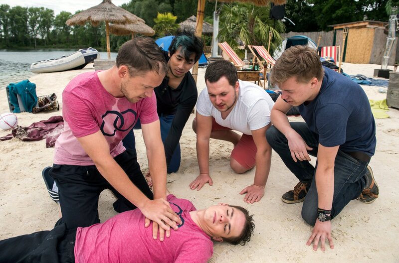 Der Junggesellenabschied endet mit einem bösen Erwachen: Max (Kai Malina, l.) muss seinen Freund Oli (Marvin Linke, v.) bewusstlos aus dem See retten und versucht ihn zu reanimieren.