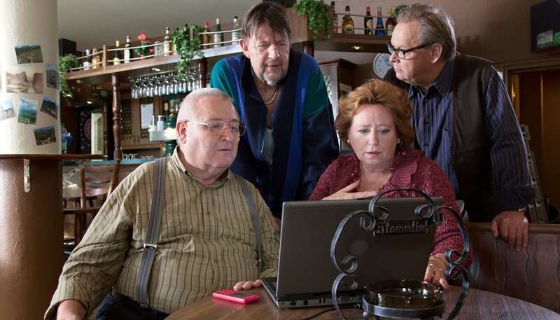 ARD KRÜGER AUS ALMANYA, Deutschland 2015, Regie Marc-Andreas Bochert. Paul Krüger (Horst Krause) und Kneipenwirtin Karin (Marie Gruber) buchen im Beisein ihrer beiden Freunde Eckhard (Jörg Gudzuhn) und Bernd (Fritz Roht) über das Internet eine Reise in die Türkei, um Pauls Enkelin zu besuchen.