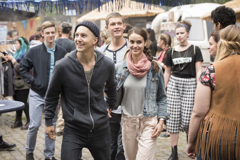 V.l.: Alex (Timur Bartels), Leo (Tim Oliver Schultz), Jonas (Damian Hardung) und Emma (Luise Befort) genießen das Festival, welches sie durch Zufall entdeckt haben, nachdem sie sich auf ihrer Rückfahrt vom Meer nach Köln verfahren haben.