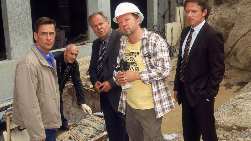 Die Ermittler (li. Wolfgang Krewe, Klaus Schindler, Wolfgang Bathke; re. Axel Pape) wollen von dem Polier (Holger Gimpel, 2.v.re.) wissen, was er beobachtet hat.
