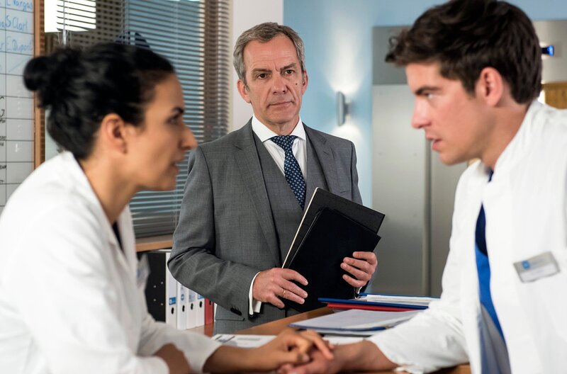 • Ben (Philipp Danne, r.) berichtet Leyla (Sanam Afrashteh, l.) von seiner Enttäuschung, da tritt sein Vater Prof. Richard Ahlbeck (Paul Frielinghaus, M.) heran.