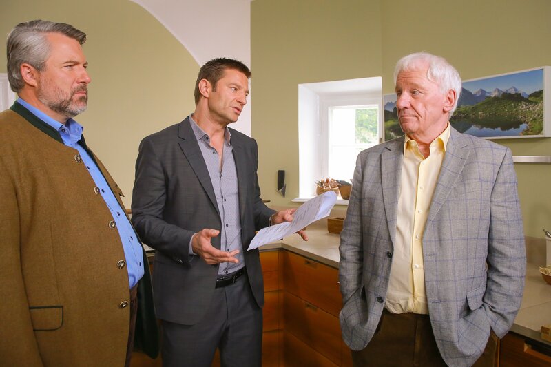 Die Kommissare Stadler (Dieter Fischer, l.) und Hansen (Igor Jeftic, M.) verdächtigen Robert Pröbstl (Nikol Voigtländer, r.), der Schulden bei seinem ermordeten Freund hatte.