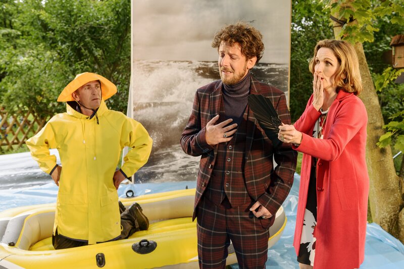 • Für Regisseur Rebstock (Marian Meder, M.) geht beim Dreh für den Fischotter-Werbespot alles schief. Fritz Fuchs (Guido Hammesfahr, l.) und seine Schwester Suse (Eva Mannschott, r.) versuchen, ihn bei Laune zu halten.