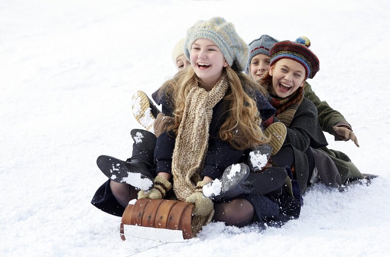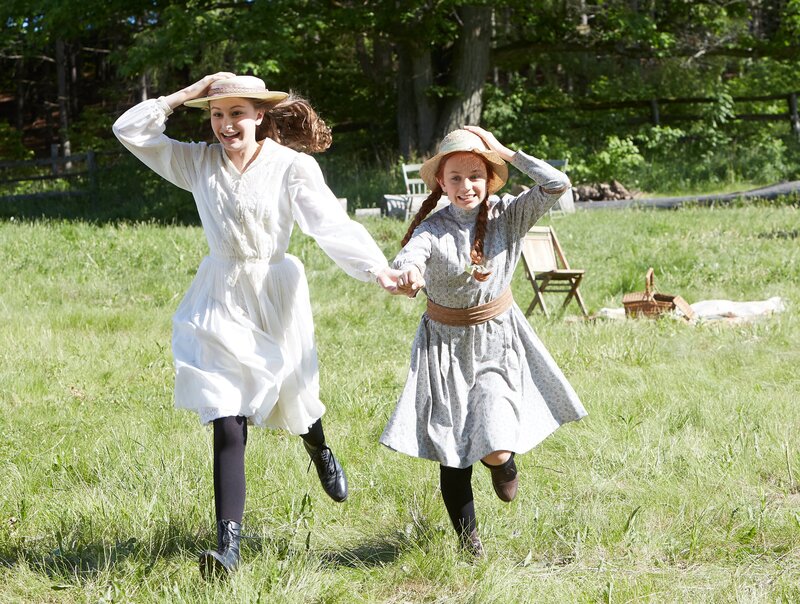 Anne Shirley (Ella Ballentine); Anne (Ella Ballentine, Mitte) beim Schlittenfahren; Von links: Diana Barry (Julia Lalonde) und Anne Shirley (Ella Ballentine).
