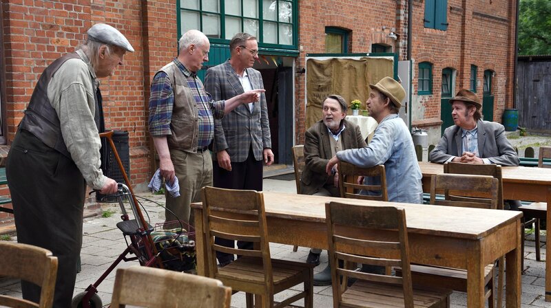 Die Bauern (Jan Fedder, re., Peter Heinrich Brix, 2. v. re.) bereiten alles vor. Doch zu dem Treffen erscheinen auch (Shorty, 2.v. li.) und Jürgen (Dirk Martens, 3. v. li.) der einen Investor für seinen maroden Friseursalon sucht, sowie Onkel Krischan (Hans Kahlert, li.) der vom Erfolg derjenigen profitieren will, die er als Musiklehrer unterrichtete.