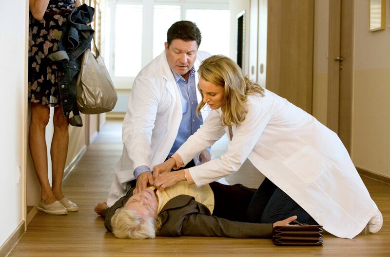 Frau Meerwein (Christiane Blumhoff, M.) erleidet einen Herzstillstand. Christian (Francis Fulton-Smith, l.) und Tanja (Christina Athenstädt, r.) leisten erste Hilfe.