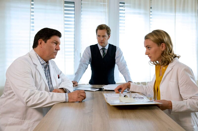 Krisensitzung: Dr. Christian Kleist (Francis Fulton-Smith, l.), Dr. Timotheus von Hatzfeld (Tom Radisch, M.) und Tanja Ewald (Christina Athenstädt, r.) beraten sich wegen der horrenden Reparaturrechnung für das CT.