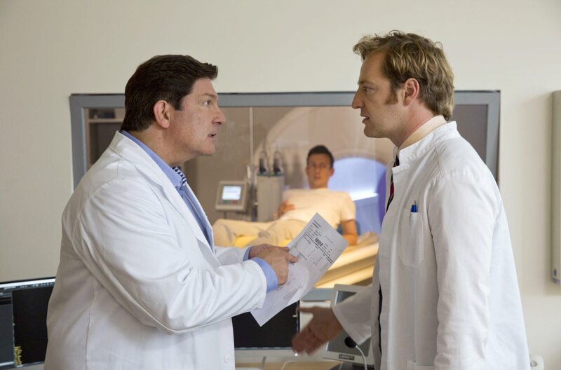 Als Timo (Tom Radisch, rechts) die Kontrastmittelgabe bei David (Patrick Diemling, Mitte) starten möchte, platzt Christian (Francis Fulton-Smith) ins Zimmer.