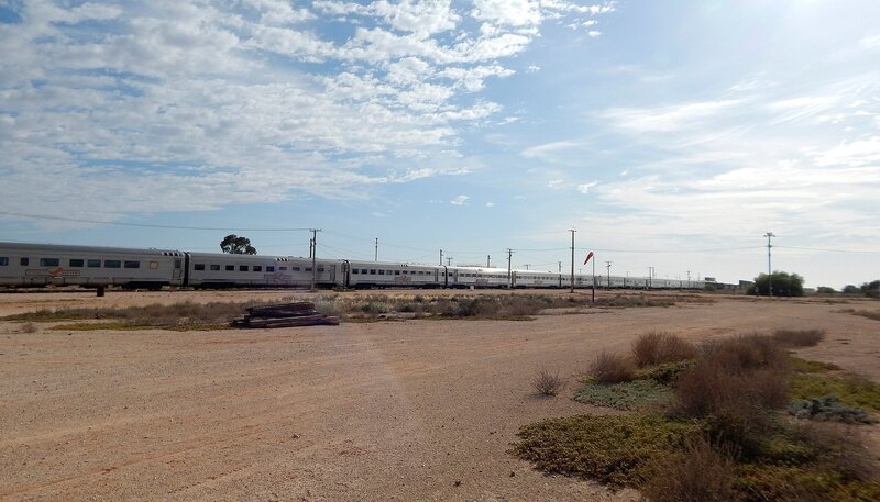 Zwischenstopp im Outback. Über vierhundert Kilometer führen die Gleise hier schnurgeradeaus.